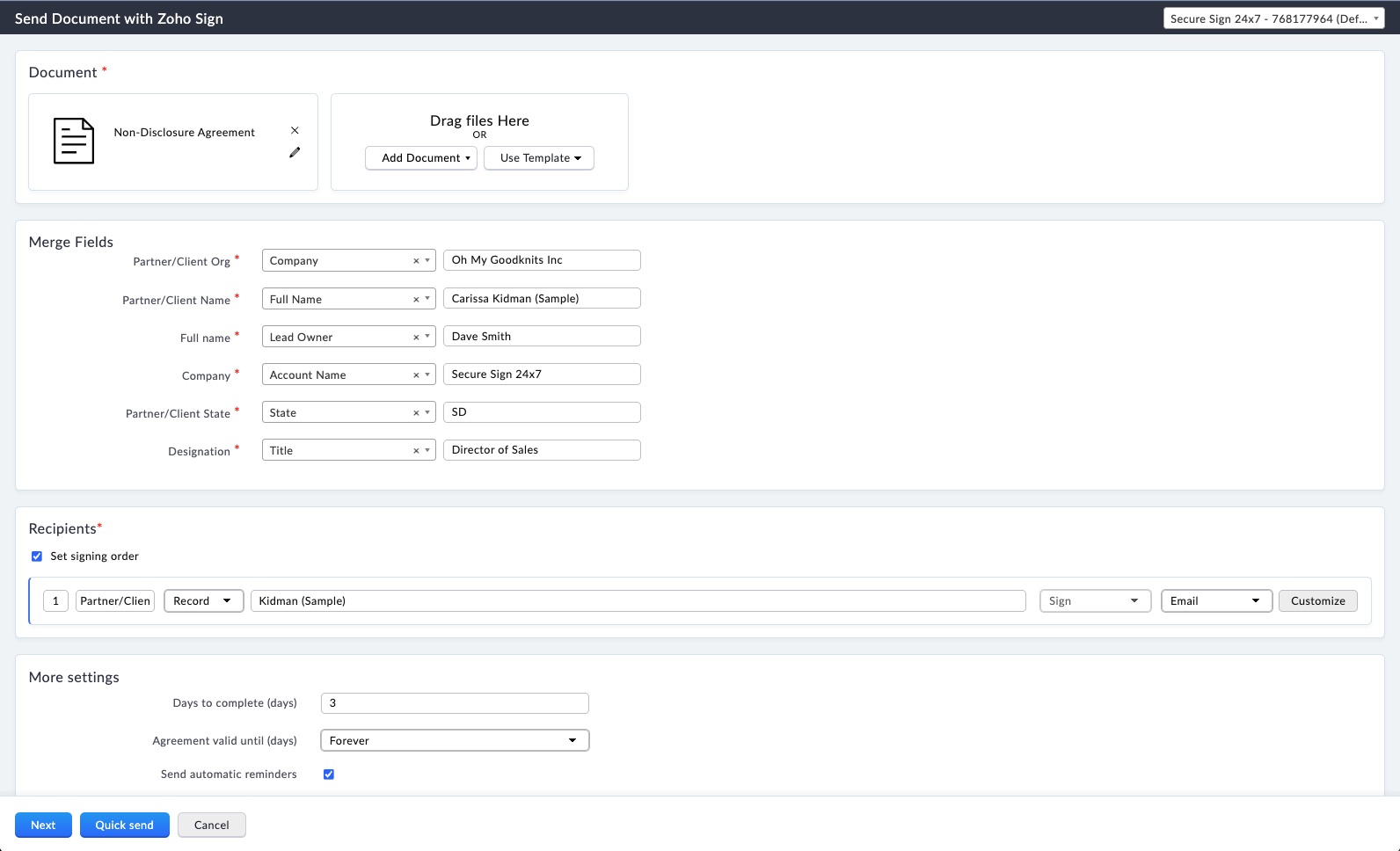 · name the template as 'nda for employees', set the time before which the document should be signed by the recipients, and add the document . Set up the zoho crm trigger, and make magic happen automatically in zoho sign. Zoho sign's new extension for zoho crm now offers improved integration, including many exclusive features such as text tags, automated signing workflows using . Do you still use pen and paper to sign your customer sales agreements, purchase orders, supply contracts, invoices, and other documents? Rated the best crm system of 2020.